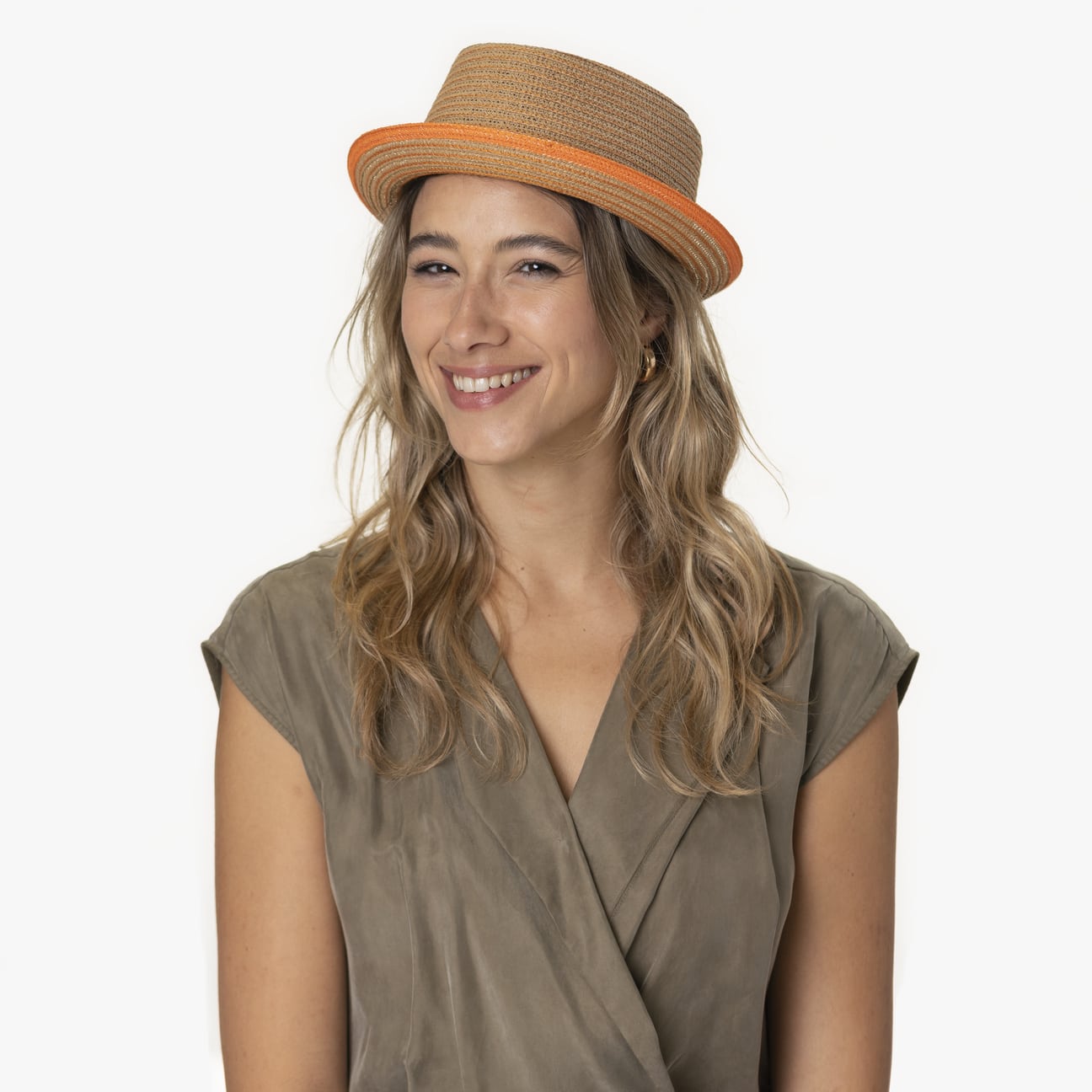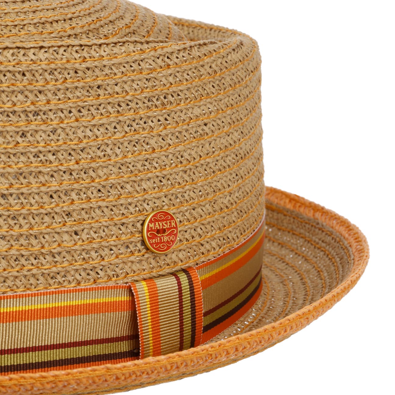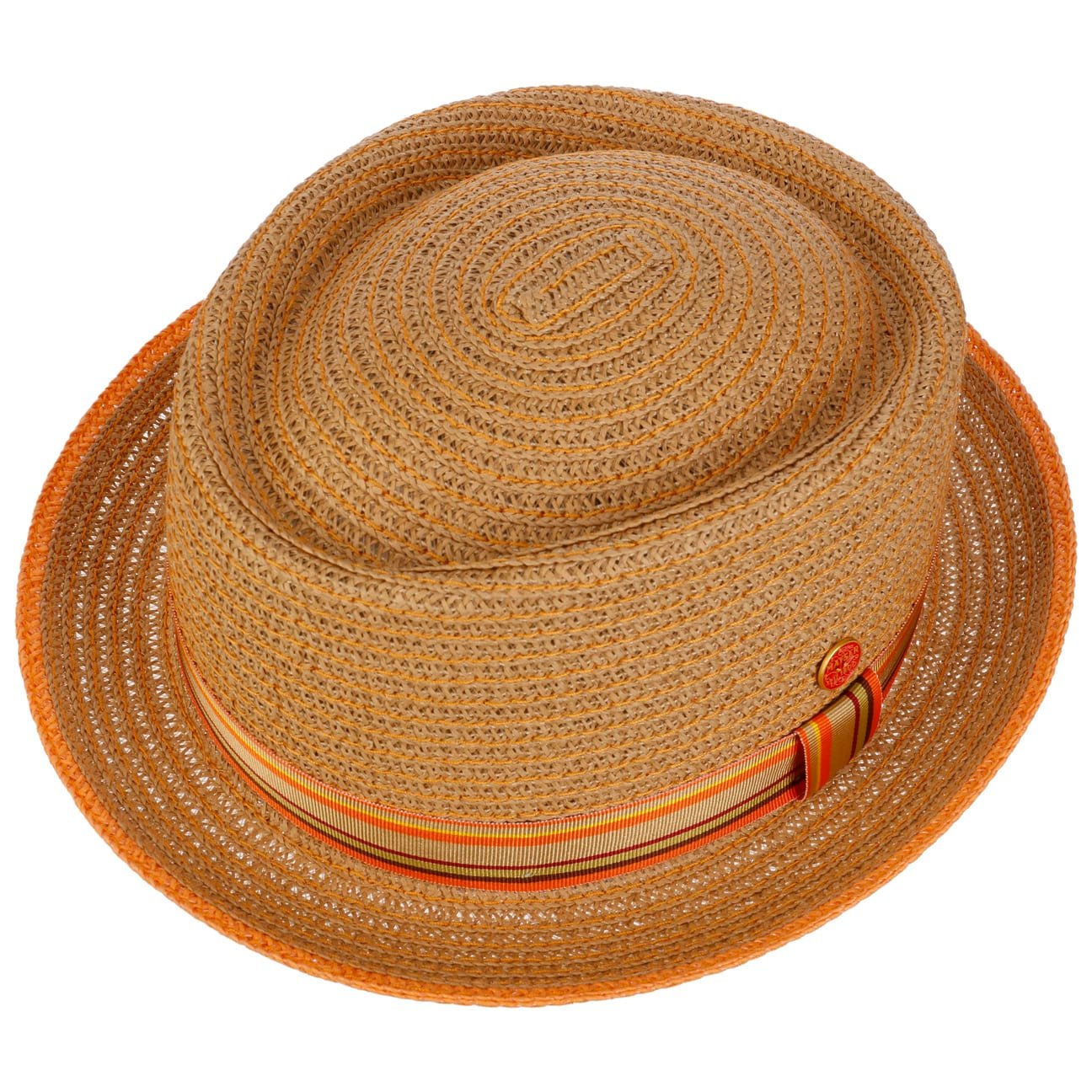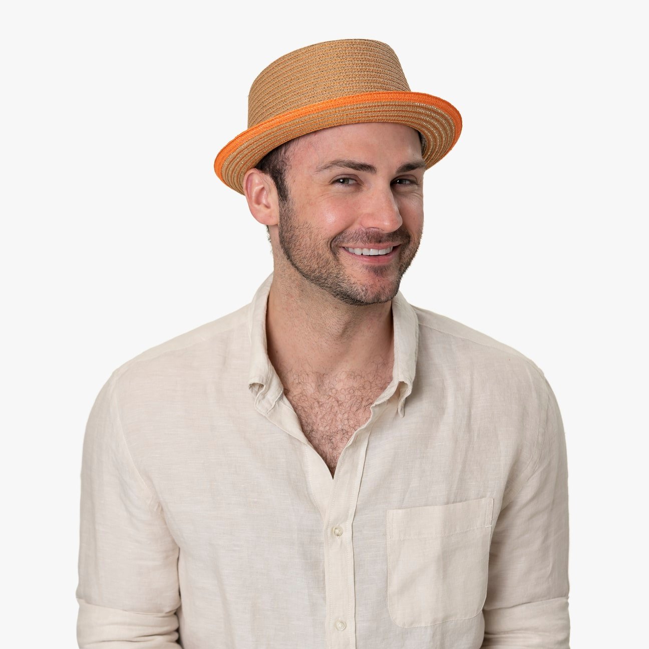Für echte Charakterköpfe. Langweilige Hüte tragen kann jeder. Mit dieser farbstarken Kopfbedeckung beweist Mann Mut zum eigenen Stil. Der originelle Pork Pie mit seiner charakteristisch runden Form und der nach oben geneigten Krempe strahlt jede Menge Energie und Lebensfreude aus. Dazu passen die sorgsam aufeinander abgestimmten Farbtöne mit dem fein gestreiften Garniturband. Ein hoher Anteil an leichtem und gleichzeitig robustem Papierstroh garantiert maximalen Tragekomfort. Kann bei Bedarf zusammengerollt im Koffer transportiert werden.