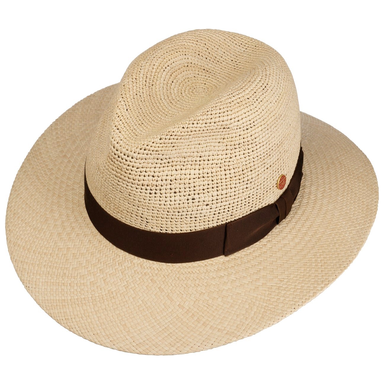 Ein exquisiter Herrenhut, gefertigt aus feinem Panamastroh, punktet mit seiner Leichtigkeit und Flexibilität. Besondere Aufmerksamkeit erregt die sorgsam gewebte Krempe sowie die gehäkelte Kopfkrone aus Toquilla-Stroh. Eine stilvolle Ripsbandgarnitur samt unaufdringlicher Schleife und geprägtem Metallemblem verleiht dem Hut einen eleganten Touch. Für zusätzlichen Komfort sorgt das breite Ripsfutterband am Innenrand des Hutes.