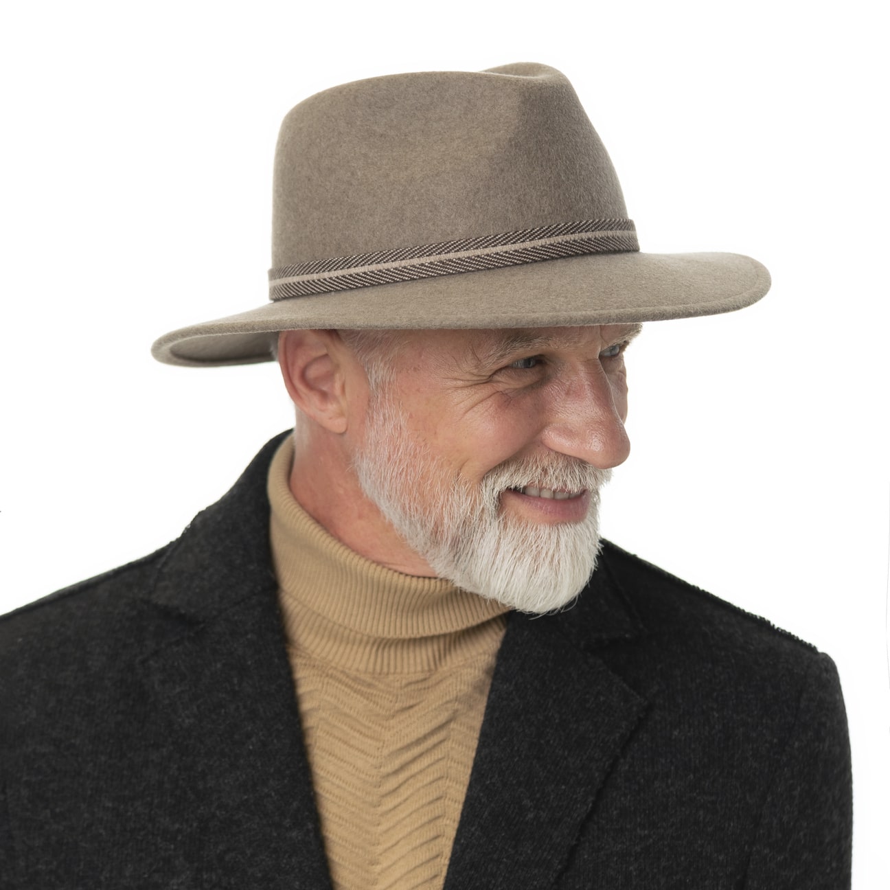 Mit diesem Travellerhut ist man bestens für alle Wetterlagen ausgerüstet. Hergestellt aus reinem Wollfilz, bietet er optimalen Schutz vor Regen und Feuchtigkeit sowie Wind. Zudem verfügt der Hut über einen UV-Schutz. Die knautschbare Filzform, das Stoffgarniturband und ein seitliches Markenzeichen sorgen für eine ansprechende Optik. Ein in Deutschland entworfenes Produkt, perfekt geeignet für den Alltag oder Reisen.