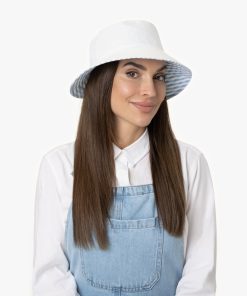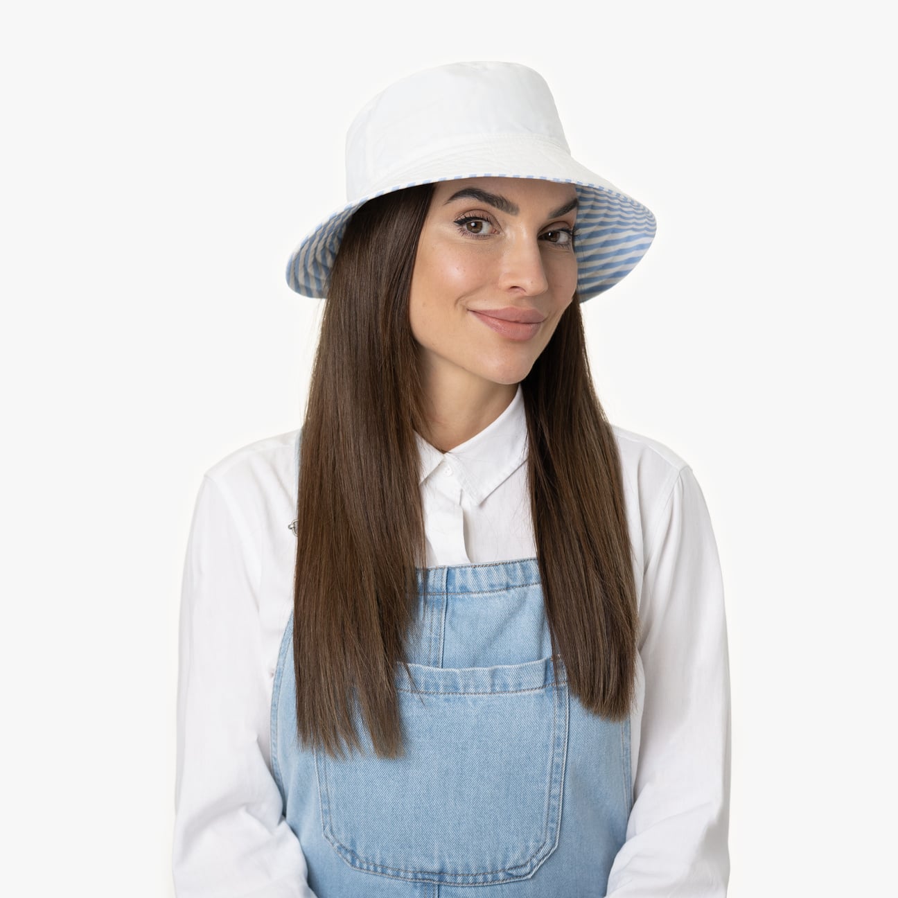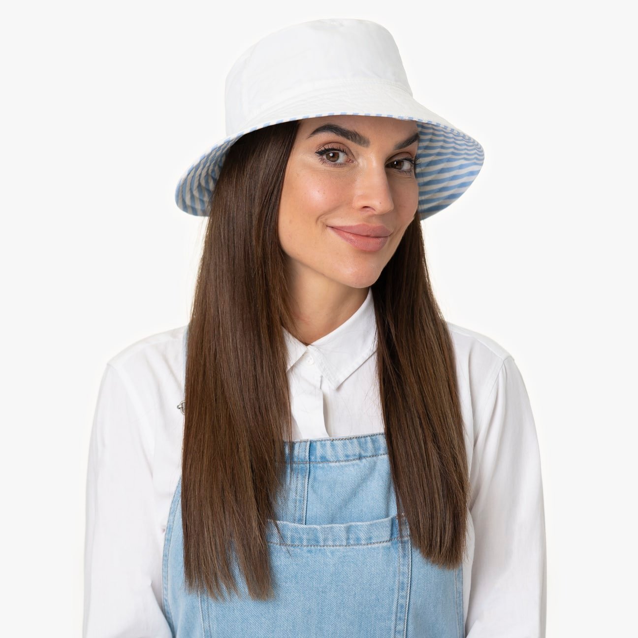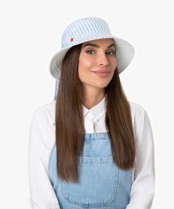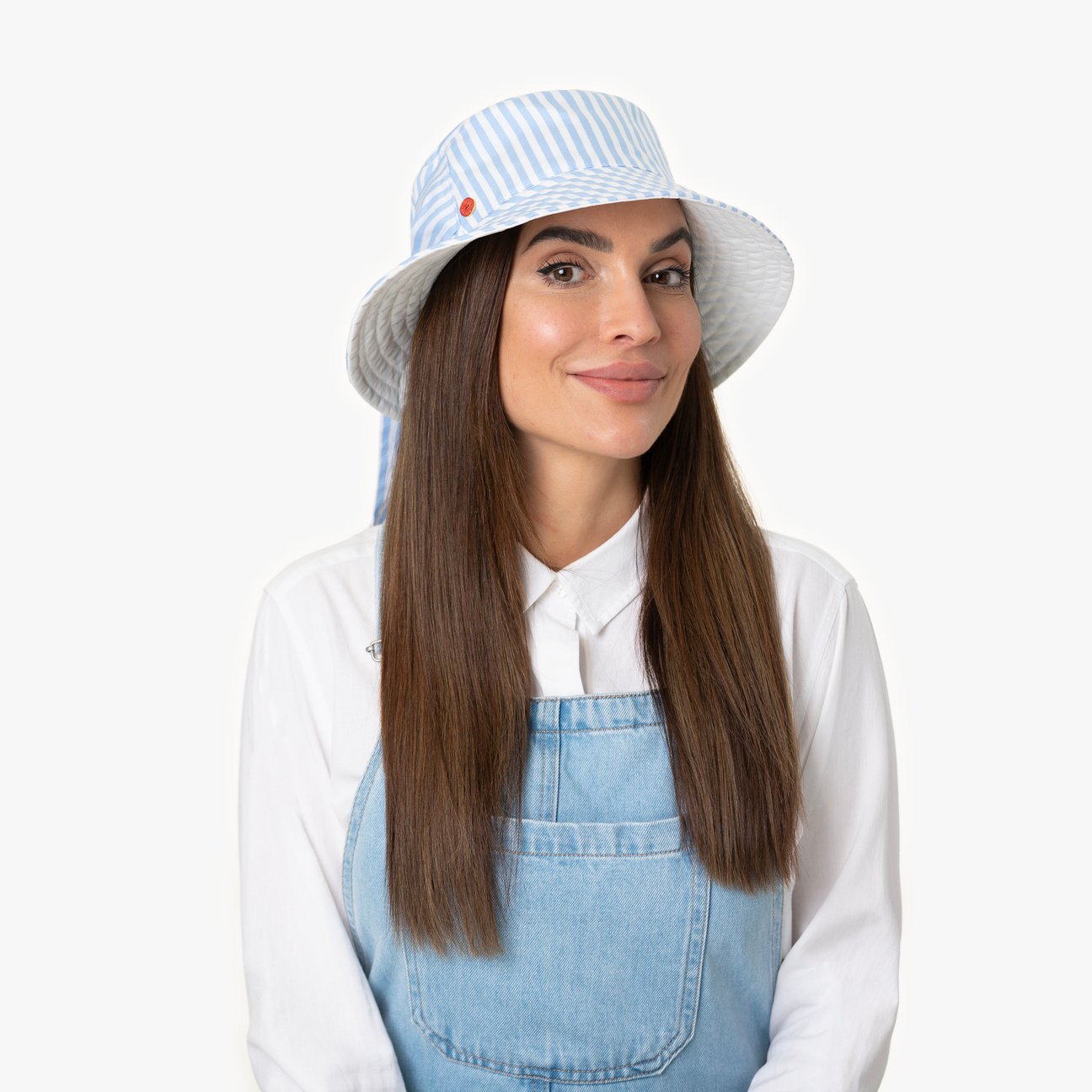 Mit seinem innovativen 2-in-1-Stil ist dieser modische Hut ein echter Hingucker. Auf der einen Seite zeigt er sich mit einem maritimen Streifenmuster, während die andere Seite in Uni gestaltet ist. Die breite Krempe und dekorative Bänder machen ihn zum perfekten Begleiter für Outdoor-Aktivitäten wie Gartenarbeit oder Ausflüge. Zudem bietet er dank UV-Schutz 80 optimalen Schutz vor Sonneneinstrahlung. Ein besonderes Detail stellt der Label-Zierknopf dar. Gefertigt wird das Accessoire innerhalb der EU aus reiner Baumwolle.