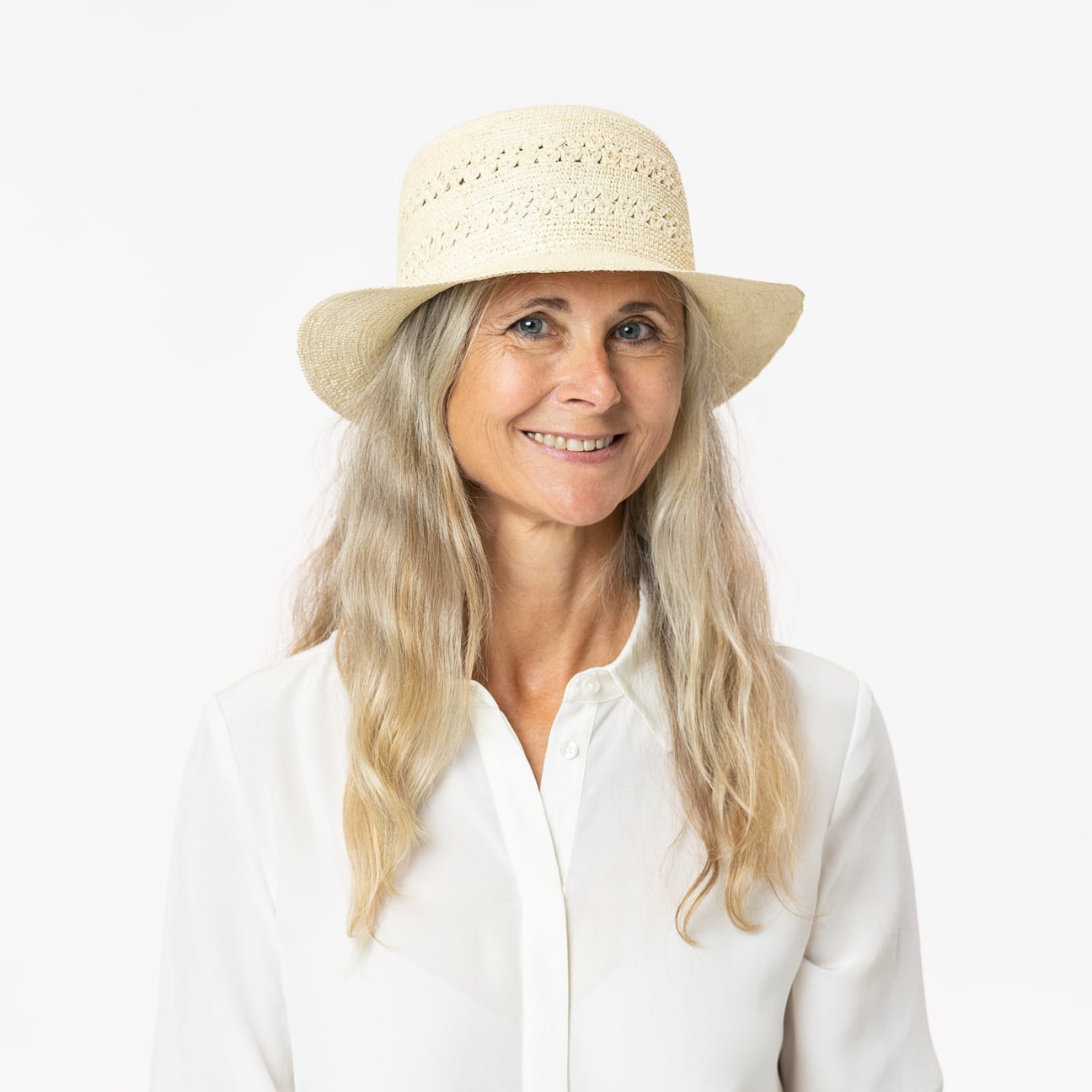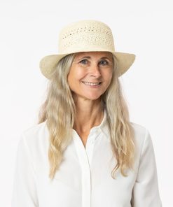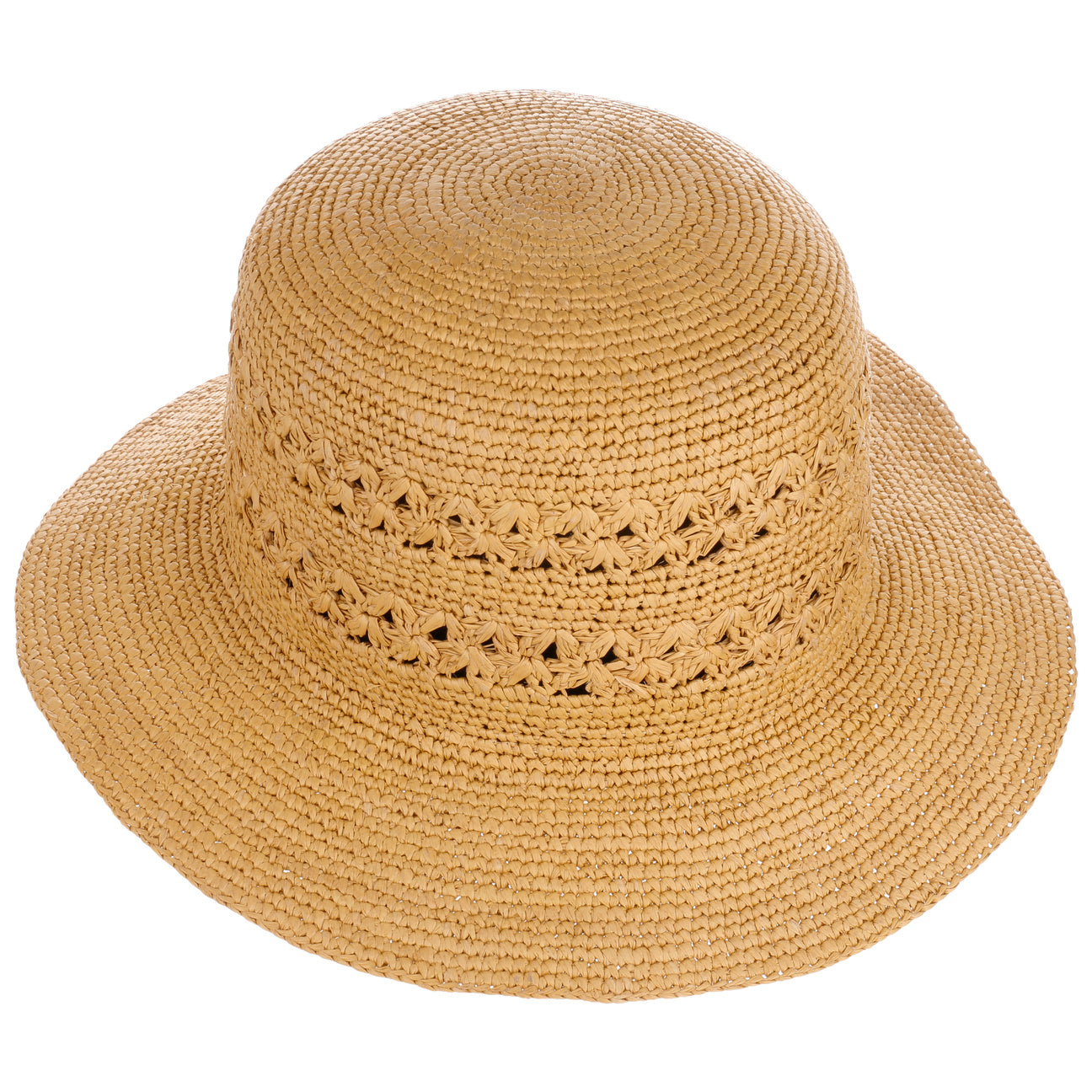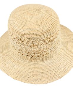 Dieser gehäkelte Glockenhut ist ein wahrhaft feminines Accessoire. Sein aufwendiges Muster verleiht ihm einen romantischen Charme, während das flexible Naturstroh eine luftige Leichtigkeit verspricht. Auf Reisen oder bei sommerlichen Gartenpartys bietet der Strohhut nicht nur stilvolle Eleganz sondern auch angenehmen Schatten für Ihr Gesicht. Ein elastisches und saugfähiges Komfortfutterband im Inneren sorgt zudem für optimalen Tragekomfort.