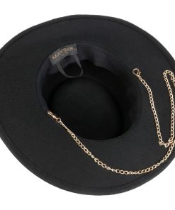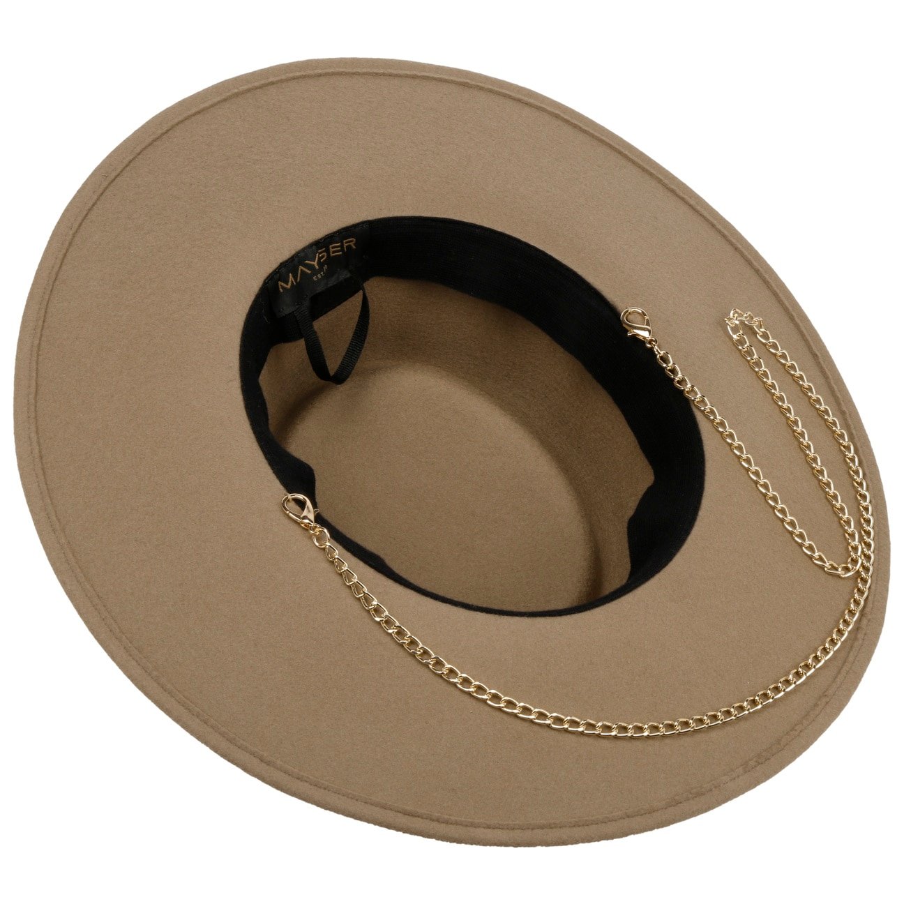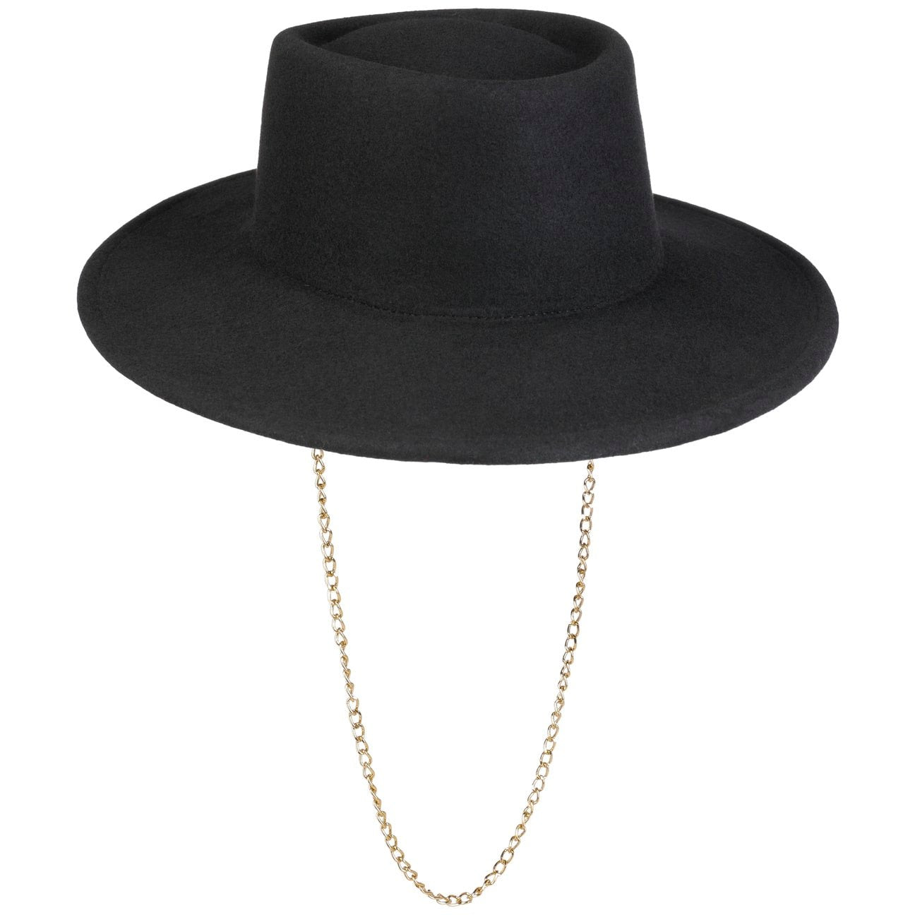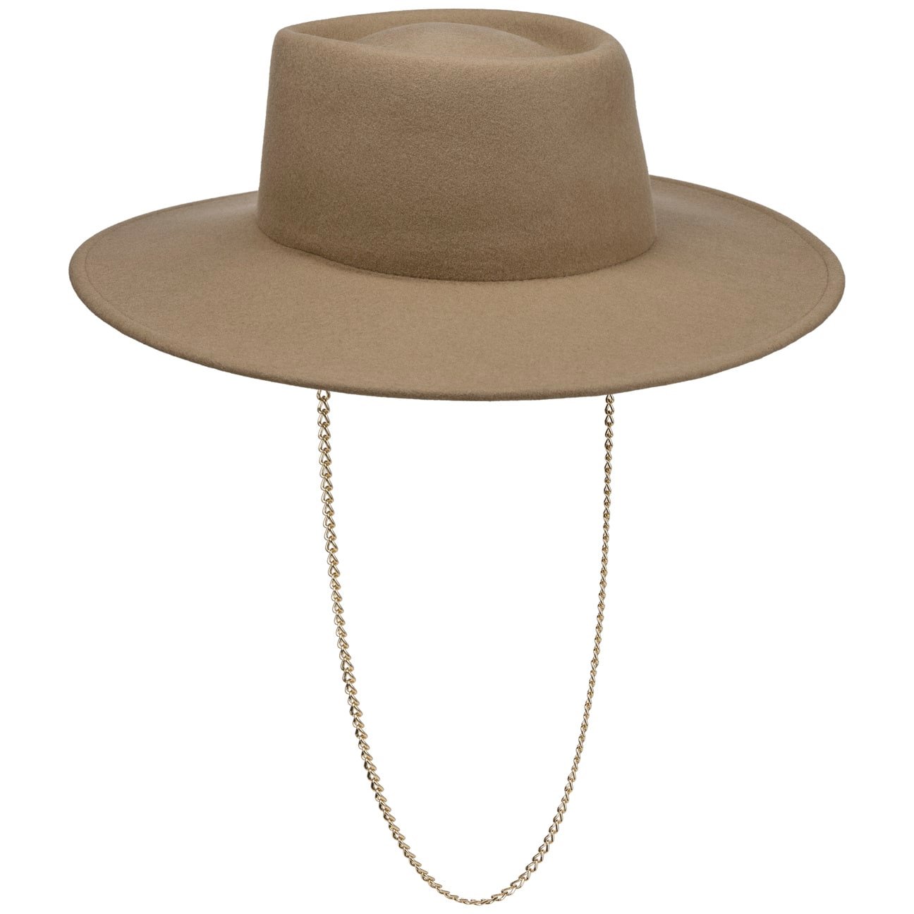Der einzigartige Winterhut für Damen besticht durch sein optional abnehmbares Kinnband, das wie eine lässig fallende Halskette wirkt. Ein echter Eyecatcher ist die breitkrempige Kopfbedeckung, die mit ihrem hochwertigen Wollfilz auch an kälteren Tagen zuverlässig wärmt. Für einen sicheren Sitz sorgt ein integriertes Stretchfutterband und praktisch zum Aufbewahren ist die Schlaufe zum Aufhängen an der Garderobe. Ideal für Frauen, die Individualität schätzen.