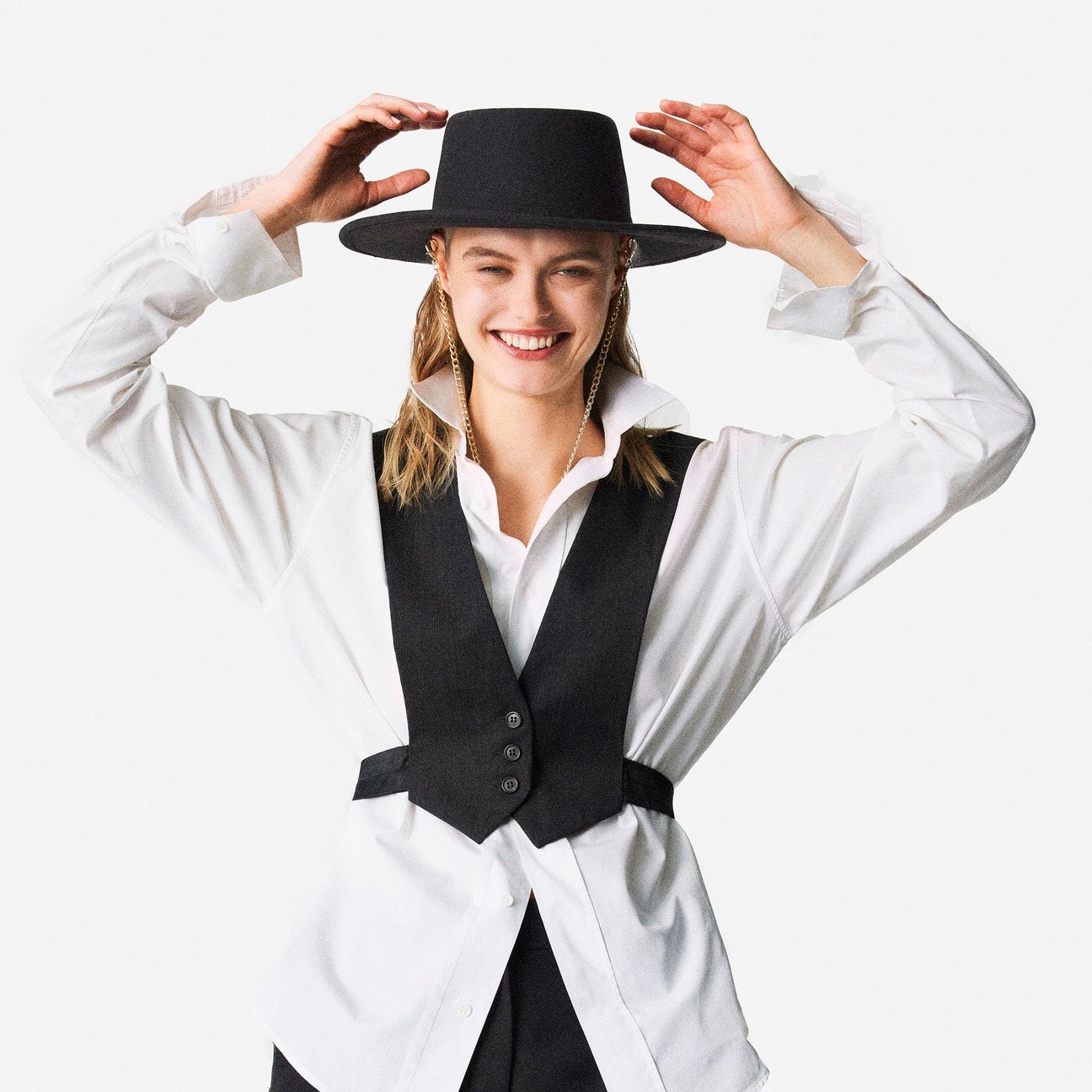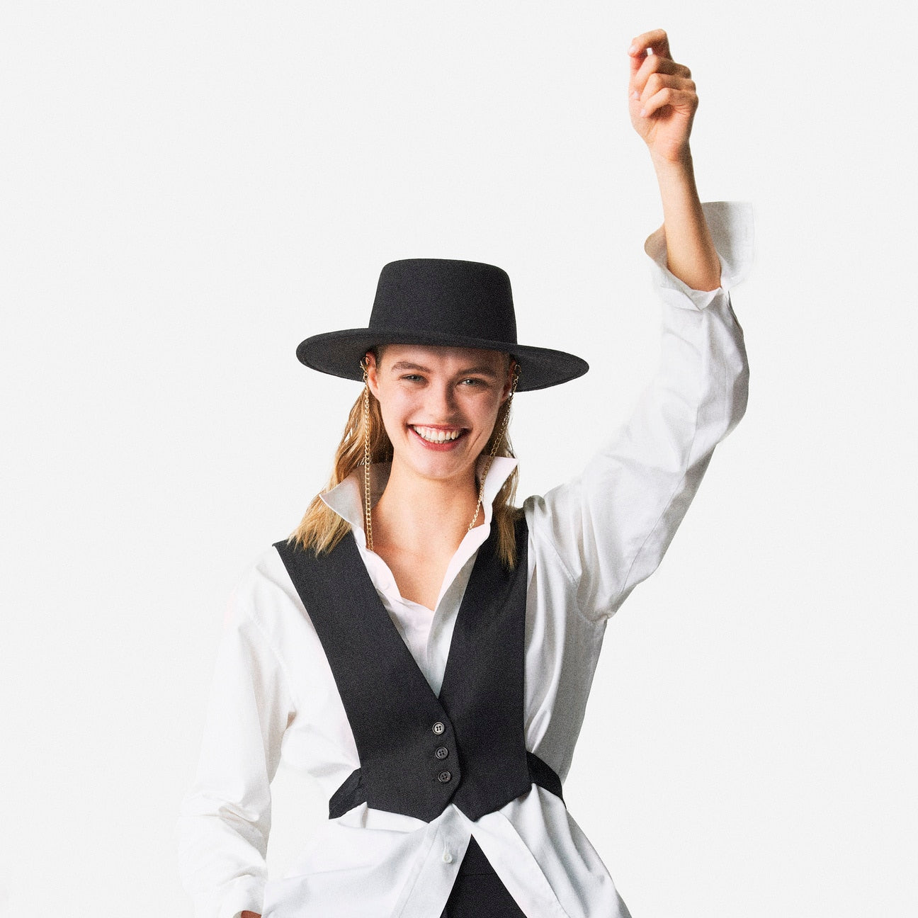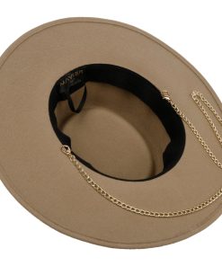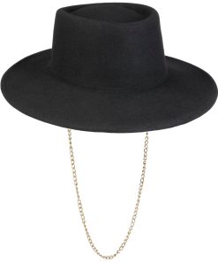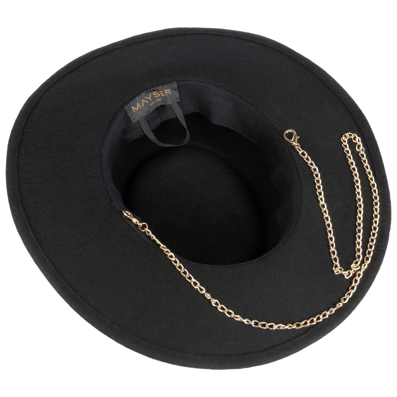 Der einzigartige Winterhut für Damen besticht durch sein optional abnehmbares Kinnband, das wie eine lässig fallende Halskette wirkt. Ein echter Eyecatcher ist die breitkrempige Kopfbedeckung, die mit ihrem hochwertigen Wollfilz auch an kälteren Tagen zuverlässig wärmt. Für einen sicheren Sitz sorgt ein integriertes Stretchfutterband und praktisch zum Aufbewahren ist die Schlaufe zum Aufhängen an der Garderobe. Ideal für Frauen, die Individualität schätzen.