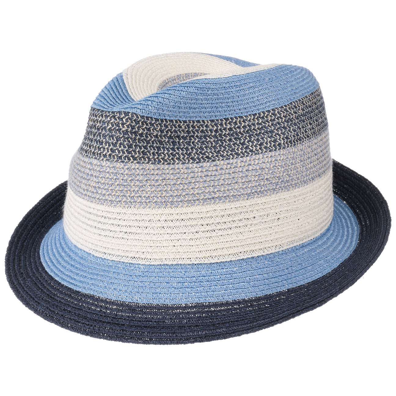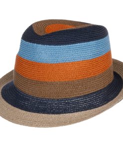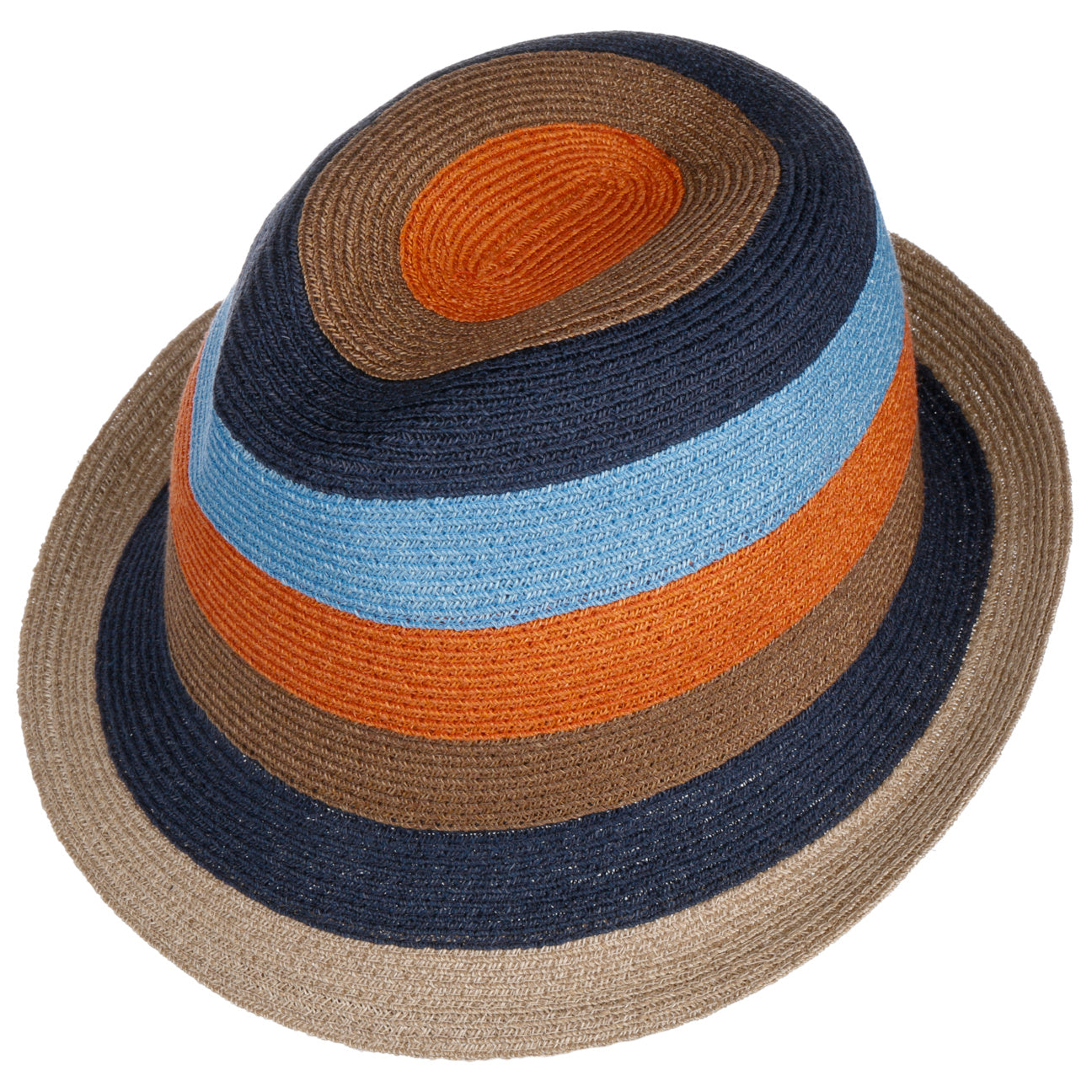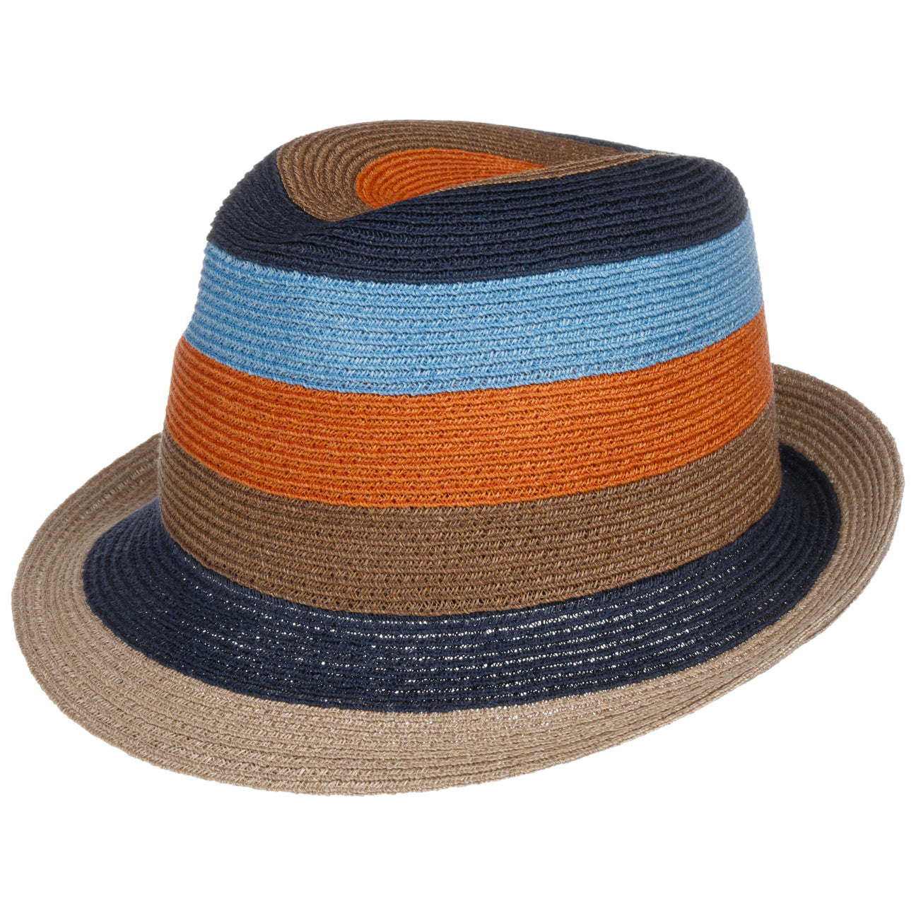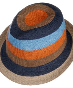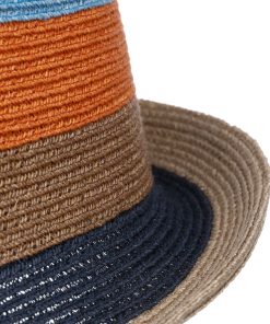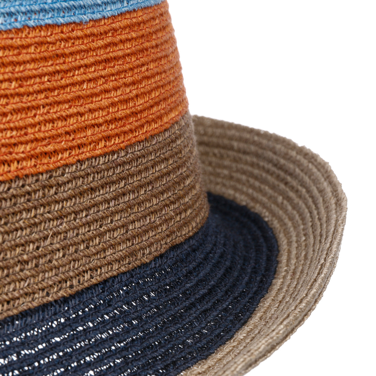 Ein auffallend farbenfrohes Design für ein selbstbewusstes Auftreten. Dieser Trilby-Hut überzeugt durch sein modisches Flechtwerk und ist der perfekte Hingucker für moderne Freizeit-Looks. Die breiten, mehrfarbigen Streifen um Kopf und Krempe sind kunstvoll in das Material eingearbeitet, während die nach oben geschlagene Krempe auf der Rückseite zusätzlichen Schwung verleiht. Gefertigt aus Hanf, Baumwolle und Leinen zeigt er sich als Qualitätsprodukt europäischer Herstellung.