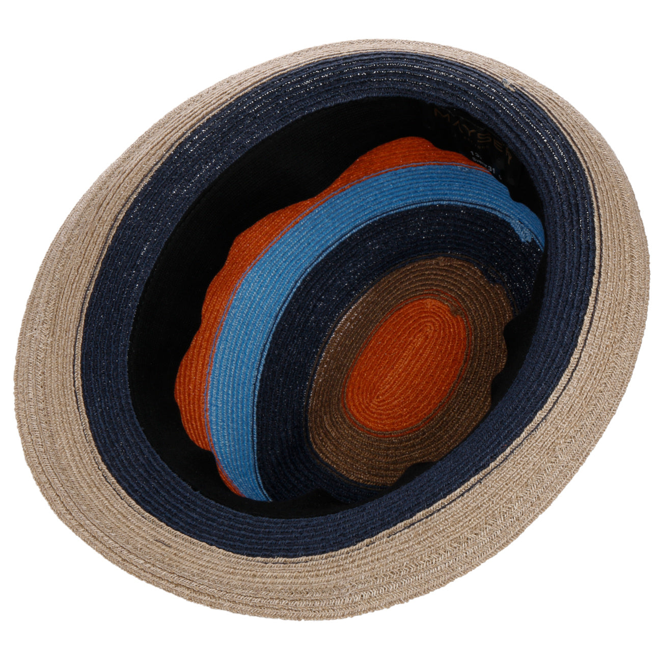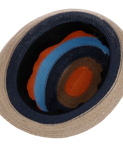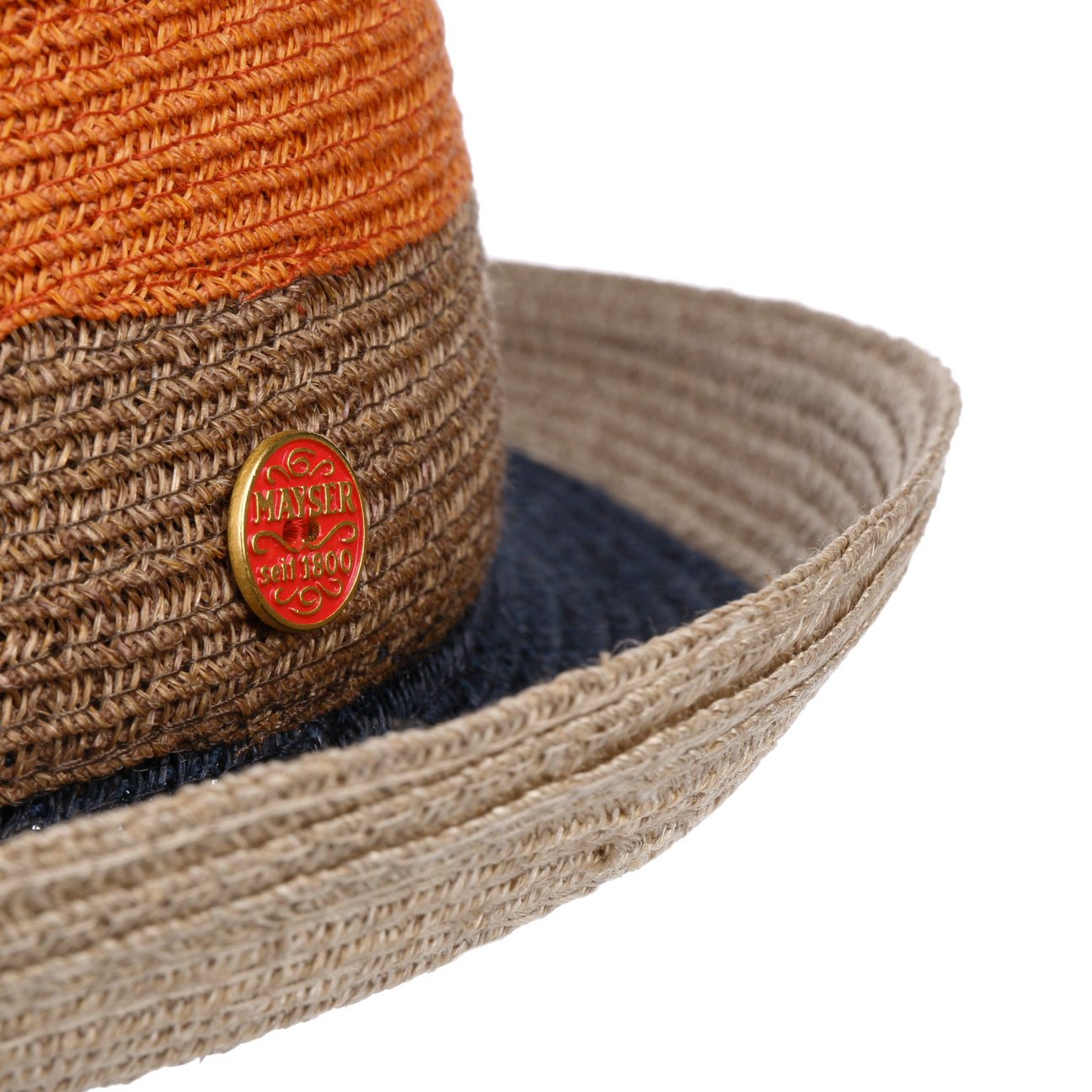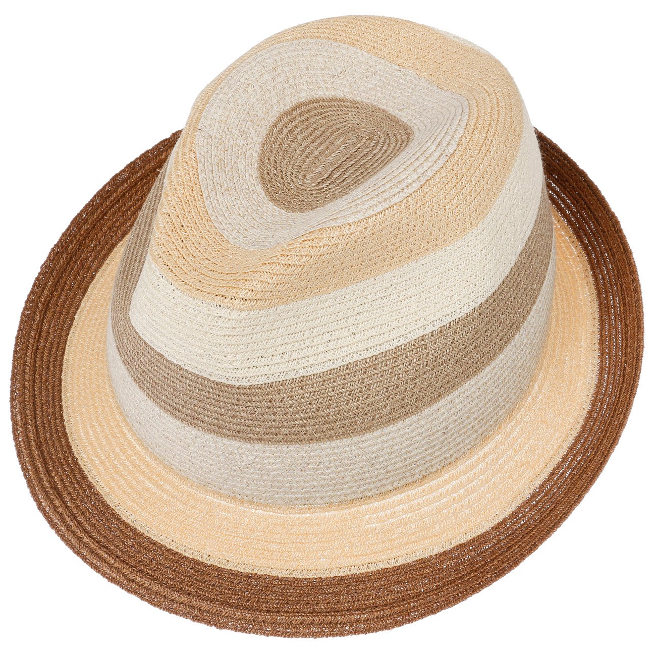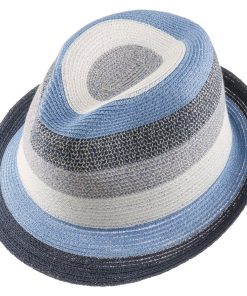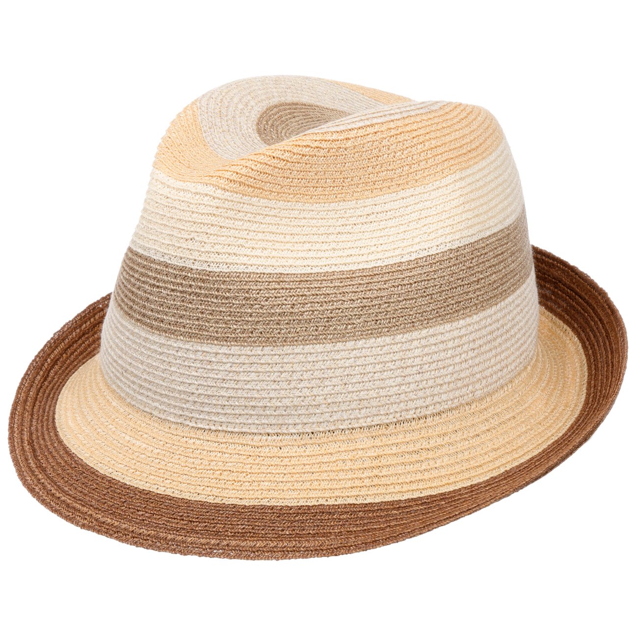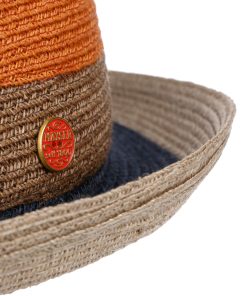 Ein auffallend farbenfrohes Design für ein selbstbewusstes Auftreten. Dieser Trilby-Hut überzeugt durch sein modisches Flechtwerk und ist der perfekte Hingucker für moderne Freizeit-Looks. Die breiten, mehrfarbigen Streifen um Kopf und Krempe sind kunstvoll in das Material eingearbeitet, während die nach oben geschlagene Krempe auf der Rückseite zusätzlichen Schwung verleiht. Gefertigt aus Hanf, Baumwolle und Leinen zeigt er sich als Qualitätsprodukt europäischer Herstellung.